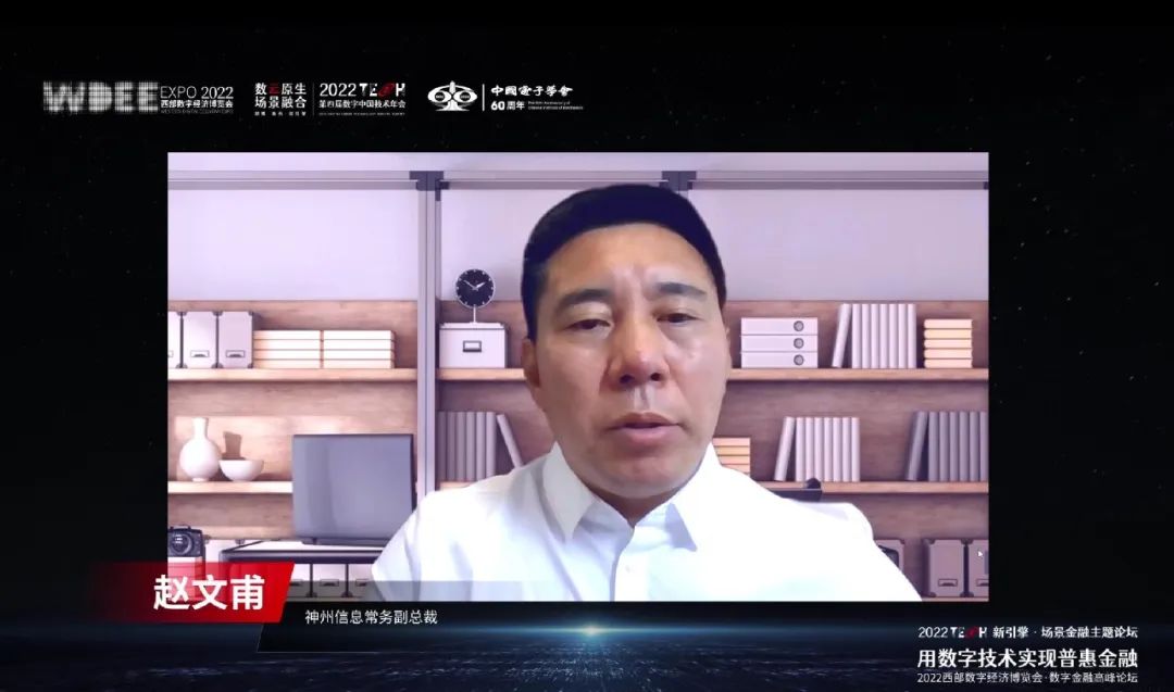神州信息常务副总裁赵文甫在《数字技术实现普惠金融》主旨演讲中谈到,当前普惠金融发展的瓶颈在于缺少针对性业务模型、专业服务人员、定向金融产品和智能化服务手段。数字技术的应用,能够提升产业全链条的效能,促进金融科技发展,同时有效拓宽金融服务广度,促进金融服务深度,提升金融服务温度,让金融服务能够触及到中国社会90%的人群,也能利用技术手段将更专业、更复杂的金融服务输送到广大客群,为客户提供更多的便利、尊重和关怀。神州信息自2018年以来,聚焦金融科技战略,以数字技术应用助力农村金融普惠、服务小微企业生产,已取得了显著成效。未来,神州信息将继续推进“科技+数据+场景”融通创新的场景金融新模式,服务于乡村振兴、实体经济高质量发展,携手生态,实现普惠金融,走向共同富裕。