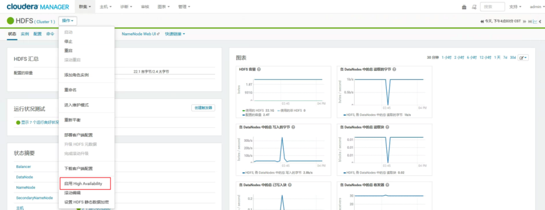 4) 高可用配置:使用CM,我们可以对关键组件进行HA部署,如CM的Web管理控制台可以对HDFS NameNode启用HA功能。