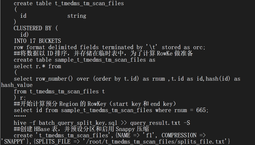 使用SQOOP执行数据迁移的目的是需要将Oracle中的结构化数据(ID)迁移到Hive中,然后在Hive中计算要预分Region的RowKey值: